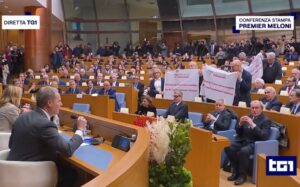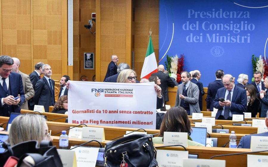 «Giornalisti da 10 anni senza contratto, ma alla Fieg finanziamenti milionari»: è il testo di un piccolo striscione mostrato da Alessandra Costante, segretaria generale della Federazione nazionale della Stampa italiana, insieme con il presidente della Fnsi, Vittorio di Trapani, nell’aula dei Gruppi parlamentari della Camera in apertura della conferenza stampa di ‘inizio anno’ della premier Giorgia Meloni, organizzata dal Consiglio nazionale dell’Ordine dei giornalisti in collaborazione con l’Associazione della stampa parlamentare, venerdì 9 gennaio 2026. Un’altra bandiera con la stessa scritta è stata mostrata da Roberto Ginex e Mattia Motta, presidente e vicepresidente dell’Inpgi, seduti accanto ai vertici del sindacato assieme ai presidenti di Casagit Salute, Gianfranco Giuliani, e Fondazione Casagit, Giampiero Spirito. Una terza è stata affidata a Gianluca Amadori e Piero Ricci, del Comitato esecutivo del Consiglio nazionale dell’Ordine, e ancora una a Stefano Tallia, presidente dell’Ordine dei giornalisti del Piemonte e Guido D’Ubaldo, presidente dell’Odg Lazio. Presenti alla conferenza stampa anche il segretario vicario Domenico Affinito e i segretari aggiunti della Fnsi, Matteo Naccari e Claudio Silvestri.