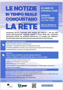Assostampa Ferrara, nell’ambito delle iniziative pianificate per celebrare i 130 anni dalla nascita dell’associazione, ha organizzato, assieme a Scoop Media Edit, cooperativa giornalistica editrice del quotidiano Estense.com, un convegno in occasione dei vent’anni dalla nascita del primo giornale esclusivamente online di Ferrara.
