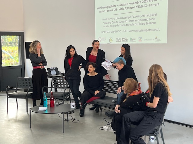 A seguire il sentito, coinvolgente e a tratti commovente reading corale per voci di donne a cura di Ferrara Off con le allieve dei laboratori teatrali condotti dalla Tessiore.