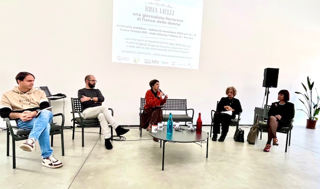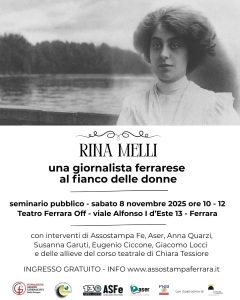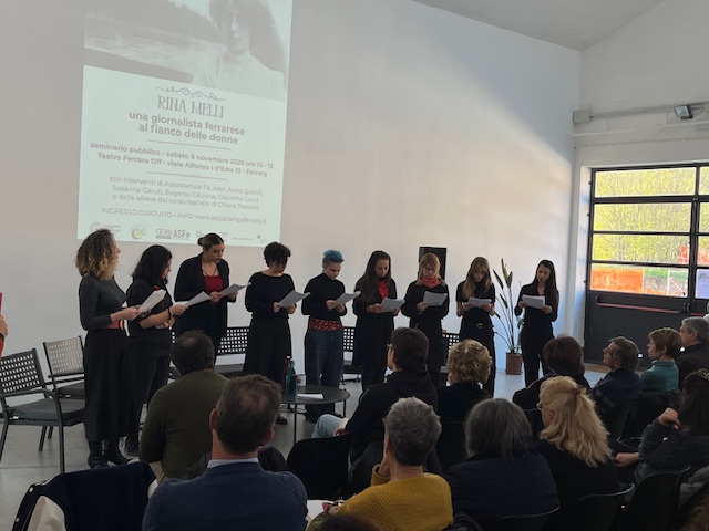 Se scioperiamo non sappiamo cosa ci aspetta, ma sappiamo cosa ci aspetta se non scioperiamo”. Nell’accorata e applaudita frase recitata dall’attrice e regista Chiara Tessiore sabato mattina (8 novembre 2025) al teatro Ferrara Off c’è tutto il senso dell’impegno politico, civile e sociale di Rina Melli, giornalista e sindacalista socialista ferrarese che all’inizio del XX secolo si impegnò per le lotte sociali dei braccianti e per l’emancipazione femminile. Una frase che è stata compendio perfetto di quello che è stato il primo convegno dedicato a Ferrara a Rina Melli, a lungo dimenticata. Infatti nell’ambito delle celebrazioni per i suoi 130 anni, l’Associazione Stampa Ferrara, con Aser (il sindacato regionale dei giornalisti ), Fnsi e Ordine dei Giornalisti, ha proposto Rina Melli: una giornalista ferrarese al fianco delle donne”, iniziativa di confronto e approfondimento, aperta al pubblico, per restituire giusta importanza e memoria a questa illustre ferrarese.