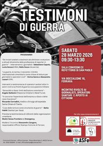 “Testimoni di guerra: operatori sanitari e giornalisti, bersagli sul fronte”, analisi degli scenari, testimonianze dirette, deontologia e diritto internazionale umanitario, è il tema del  seminario rivolto a giornalisti e operatori sanitari, aperto ai cittadini, che si terrà a Ferrara sabato 28 marzo 2026 dalle 9.30 alle 13.30, nella sala convegni ex Refettorio di San Paolo, in via Boccaleone 19.